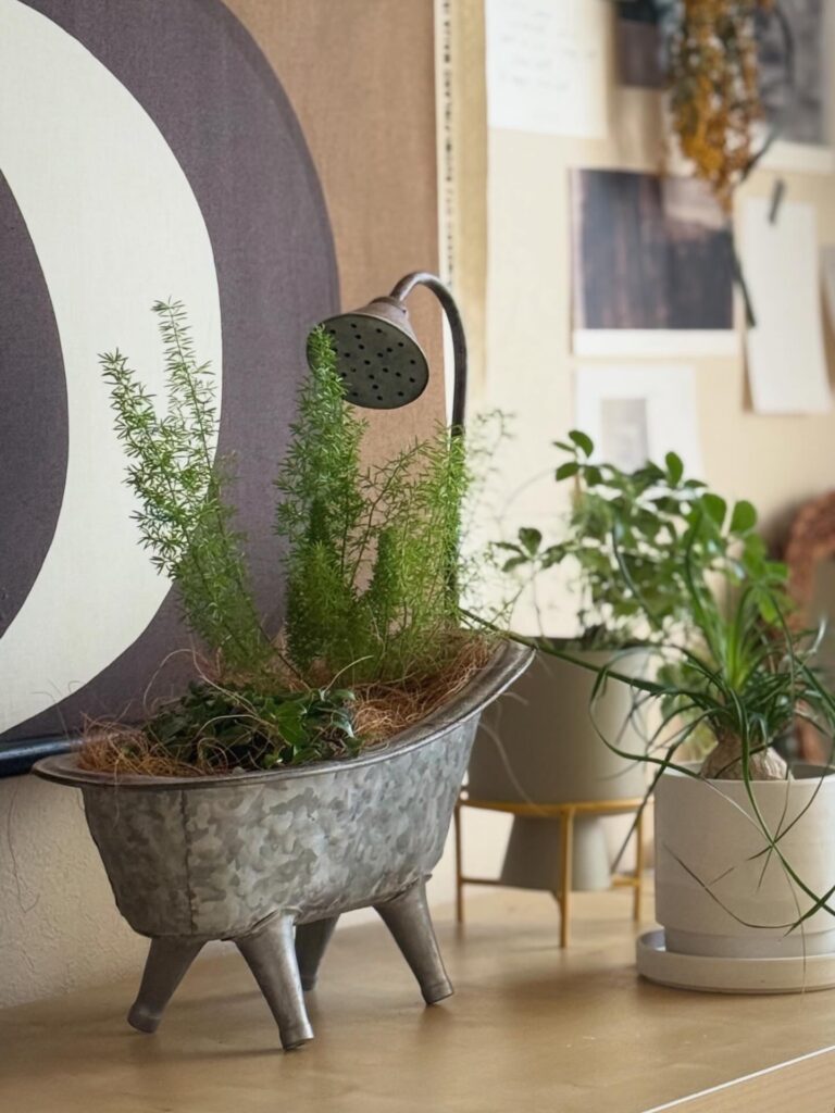 サンクショップの店頭にはワゴンにたくさんの植木鉢を並べています。シンプルで植物を引き立てるような鉢や、一目で目を惹くようなかわいらしい鉢までラインナップもいろいろです。先日サンクショップで購入いただいた鉢(手前バスタブの鉢)に素敵な寄せ植えをしたといってお客様から写真をいただきました。とってもおしゃれな寄せ植えだったのでご紹介させていただきます!