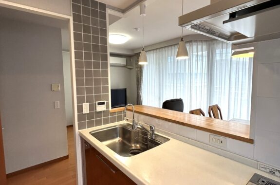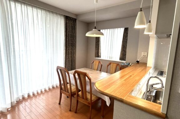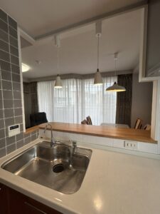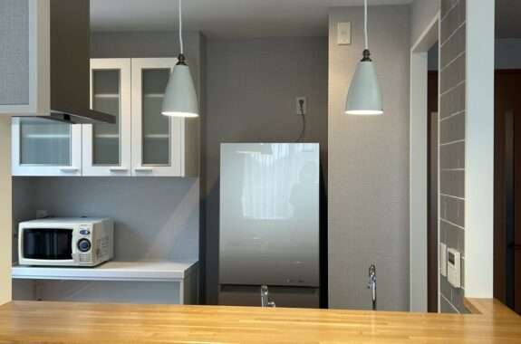 キッチン収納の見直しからスタートしました。キッチンには奥行き浅めのPanasonicの食器棚がぴったりとはまりました。使いにくいキッチンの吊り戸棚とそれに伴い一部壁を撤去したことで、リビングまですっきり見渡せ明るいキッチンとなりました。アクセントで使った焼き物のタイルが大人っぽくおしゃれです。手元灯のペンダントライト2灯とダイニング照明がライトグレーの壁紙クロスとよく調和しています。大変ご好評いただいておりますLDKの最後の仕上げにバルコニーに面した大きな窓のカーテンを新調、グレー×ゴールドの刺繍が格好良くもあり、エレガントでもあり絶妙なマッチングとなりました。