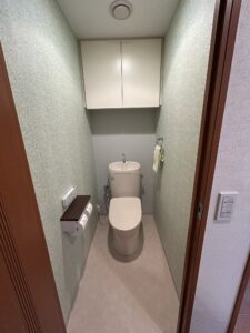 お風呂はひんやりせずお掃除も楽なTOTOのほっからり床に、お手入れが簡単で美しい人造大理石の高断熱浴槽を選びました。洗面化粧台はスタイリッシュなPanasonicのものにモザイクタイルを組み合わせ、足元の片側を空けラグジュアリーなメイクコーナーができました。トイレはアクセントクロスで楽しく、便器はベージュをチョイスして柔らかい雰囲気になりました。全体的に機能的でかつお施主様によく似合った感じの良い素敵なお家になりました。